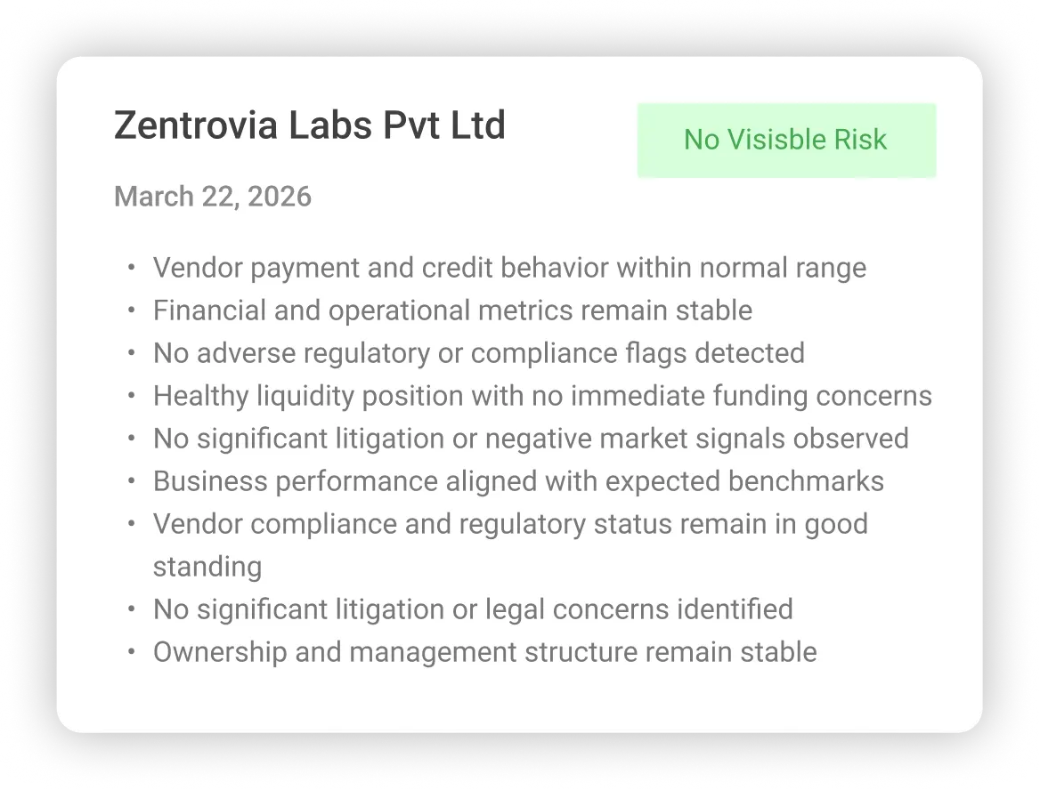 With continuous monitoring and unified risk intelligence, teams can detect risks early, track portfolio performance, and make informed decisions—helping protect investments and drive better outcomes.