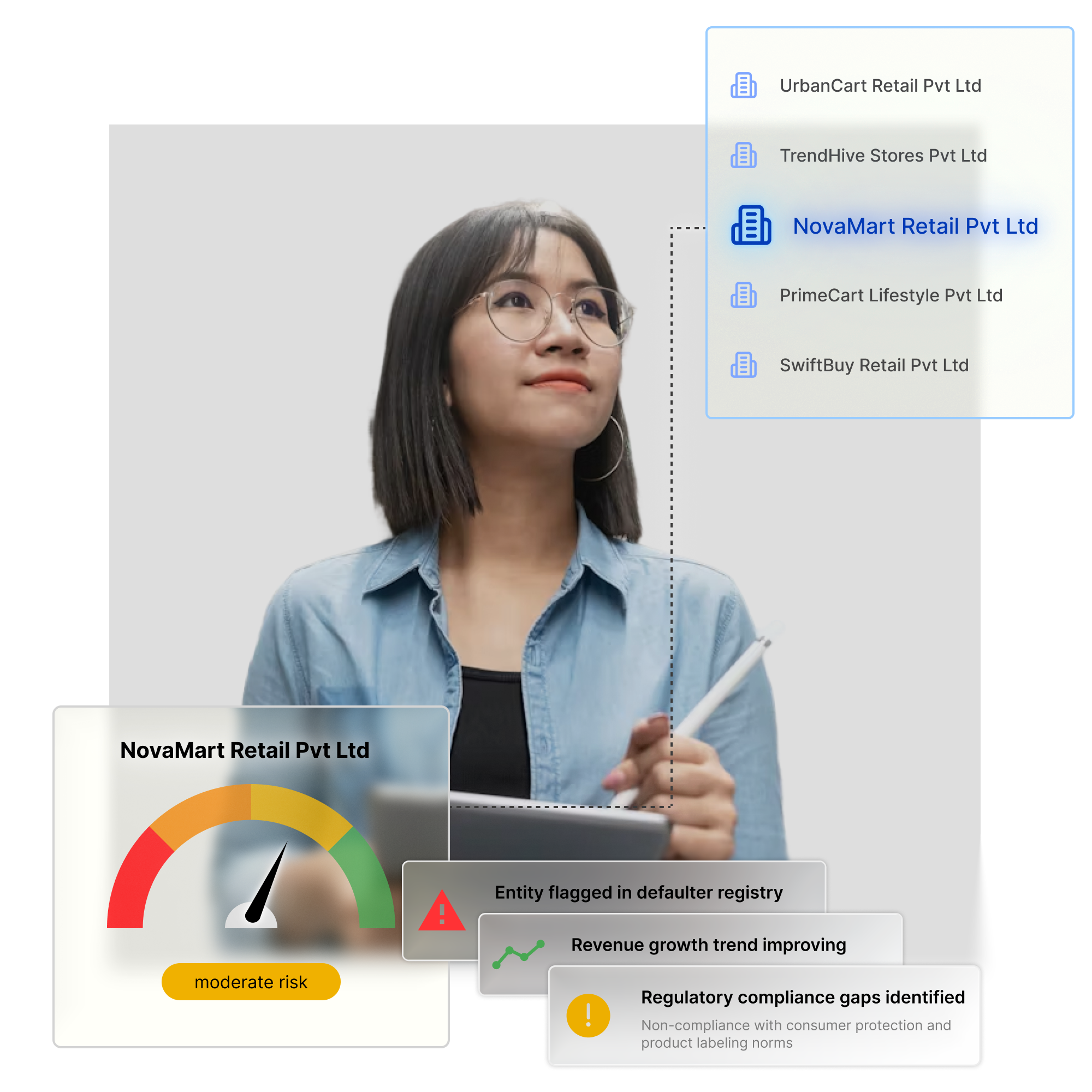 Verify entities instantly across GST, MSME, financials, and other critical parameters—so you can validate and move forward with confidence.